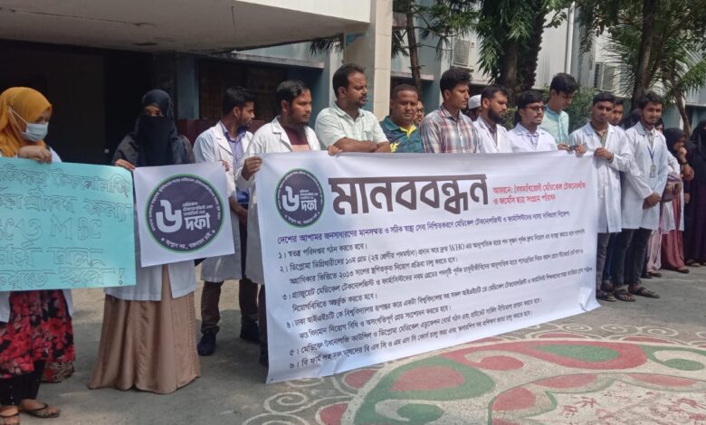 বৈষম্যবিরোধী মেডিকেল টেকনোলজি ও ফার্মেসি ছাত্র সংগ্রাম পরিষদের মানববন্ধন