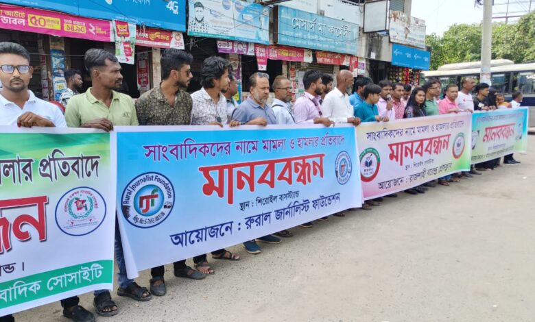 রাজশাহীতে সাংবাদিকের উপর হামলা ও মামলার প্রতিবাদে মানববন্ধন