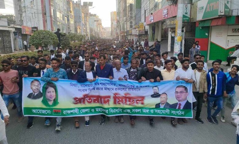মিথ্যা প্রোপাগাণ্ডের প্রতিবাদে রাজশাহীতে বিএনপির প্রতিবাদ মিছিল