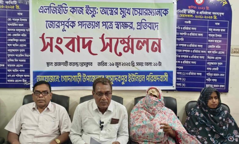 রাজশাহীর গোদাগাড়ী উপজেলার ৮ নং বাসুদেবপুর ইউনিয়ন পরিষদের চেয়ারম্যান নজরুল ইসলামকে জোরকরে পদত্যাগ পত্রে স্বাক্ষর করিয়ে নেয়া হয়েছে। বৃহস্পতিবার বেলা ১১টায় রাজশাহী বরেন্দ্র প্রেসক্লাবে এ অভিযোগ তুলে সংবাদ সম্মেলন করেছেন ভূক্তভোগী চেয়ারম্যান নজরুল ইসলাম ও ঐ ইউনিয়ন পরিষদের ৮ জন সদস্য।